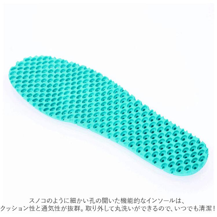 ・スノコのように細かい孔の開いた機能的なインソールは、クッション性と通気性が抜群。取り外して丸洗いができるので、いつでも清潔!