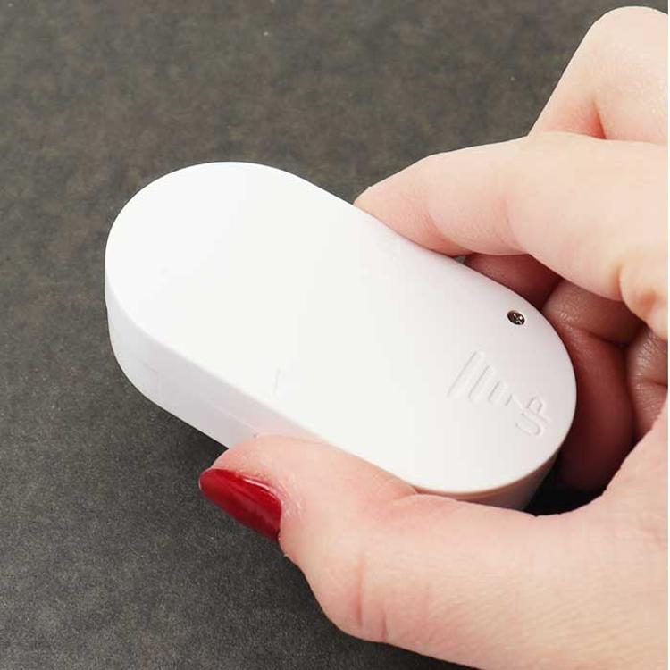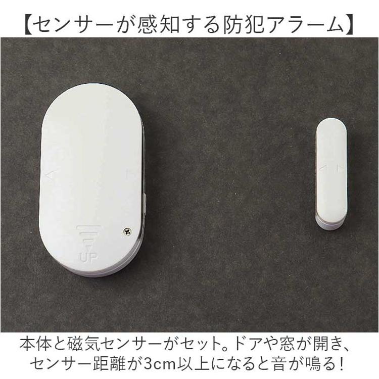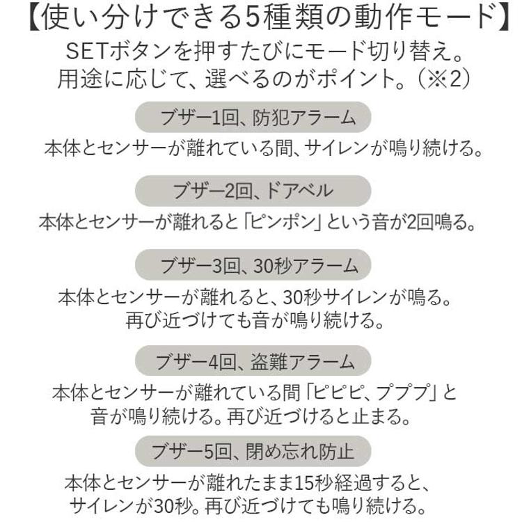 ・本体と磁気センサーがセット。ドアや窓が開き、センサー距離が3cm以上になると音が鳴る!