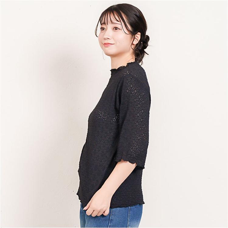・少し詰まった襟元と5分袖で、露出を控えてクラシカルさをUP。体型カバー効果も◎