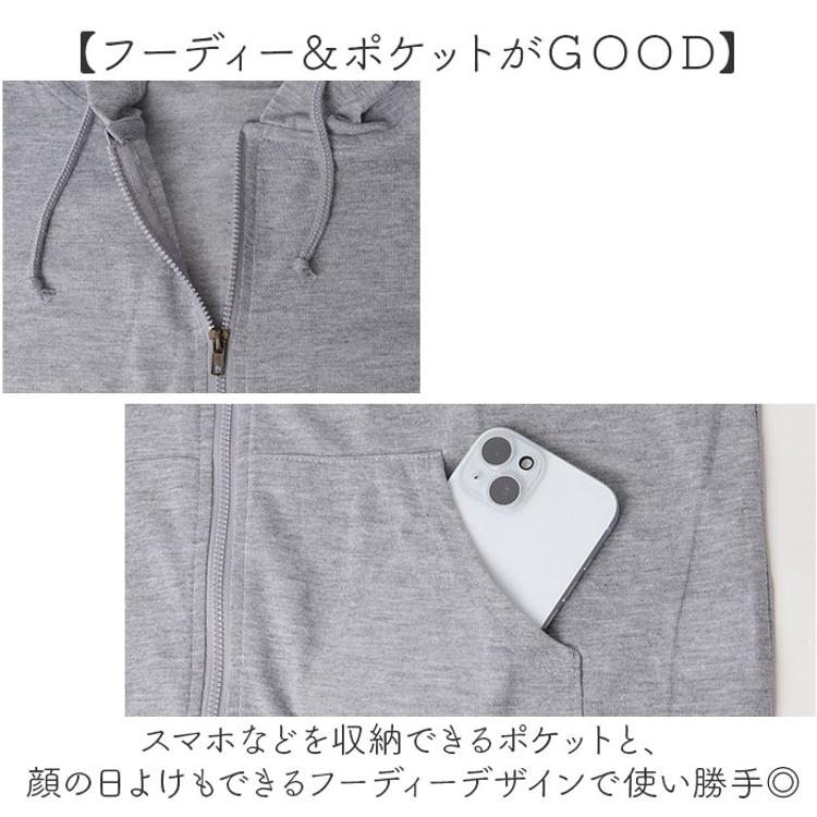 ・スマホなどを収納できるポケットと、顔の日よけもできるフーディーデザインで使い勝手◎