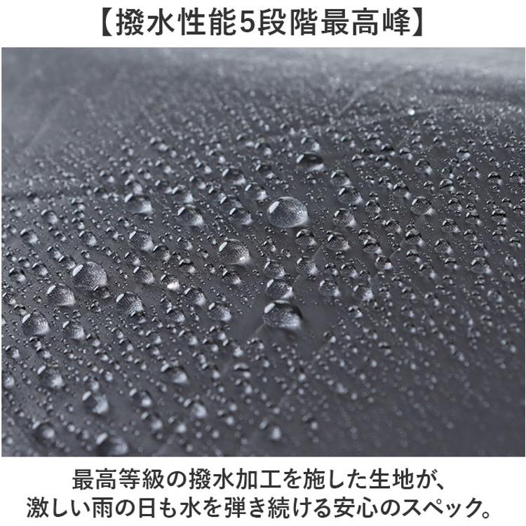 ・最高等級の撥水加工を施した生地が、激しい雨の日も水を弾き続ける安心のスペック。