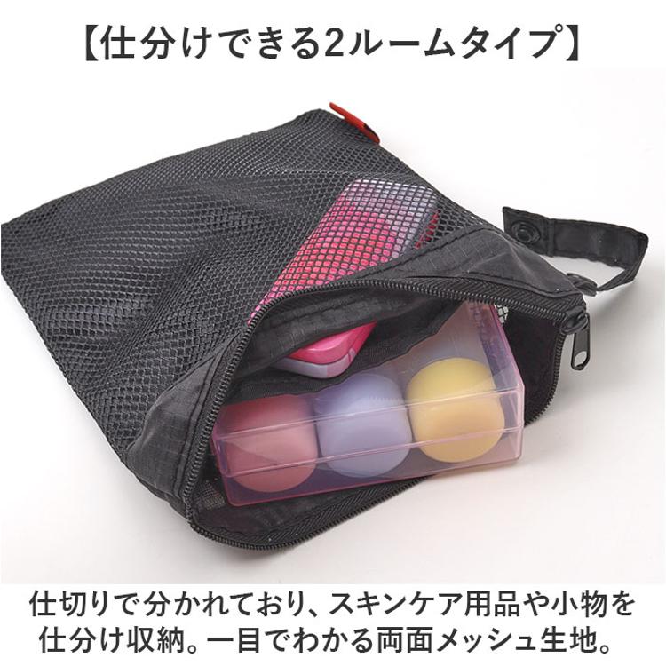 ・仕切りで分かれており、スキンケア用品や小物を仕分け収納。一目でわかる両面メッシュ生地。