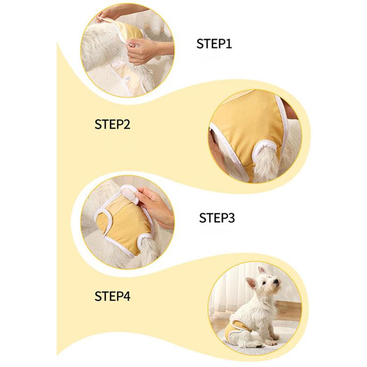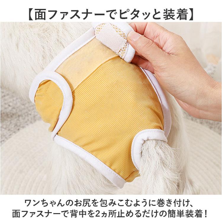 ・ワンちゃんのお尻を包みこむように巻き付け、面ファスナーで背中を2ヵ所止めるだけの簡単装着!
