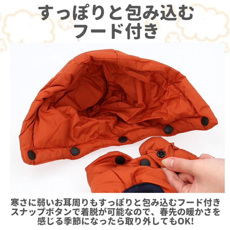 ・寒さに弱いお耳周りもすっぽりと包み込むフード付き。スナップボタンで着脱が可能なので、春先の暖かさを感じる季節になったら取り外してもOK!