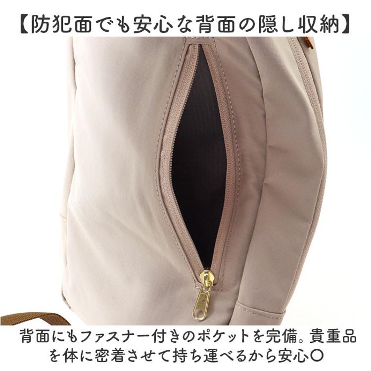 【防犯面でも安心な背面の隠し収納】 背面にもファスナー付きのポケットを完備。貴重品を体に密着させて持ち運べるから安心〇