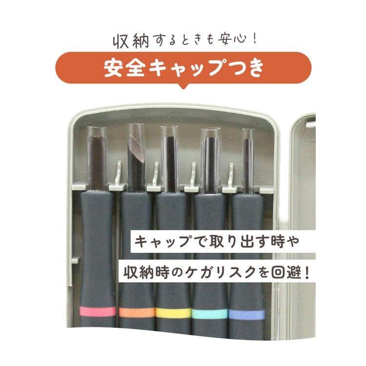 ・平刀、切り出し刀、三角刀、中丸刀、小丸刀の全5種類。刃の形状アイコンと色分けされたハンドルで、お目当ての彫刻刀がひと目でわかる♪