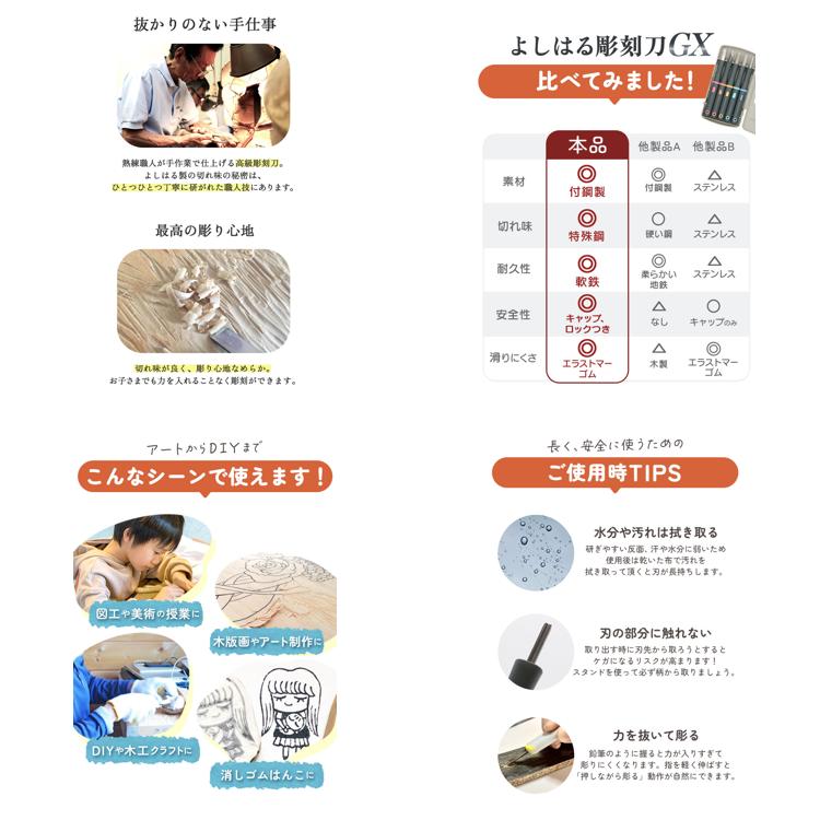 ・特殊鋼と軟鉄という二つの金属を組み合わせて、刃の表面を磨き上げた付鋼製刃を使用。一般的な鋼を使用した彫刻刀よりも耐久性に優れており、ワンランク上の切れ味!