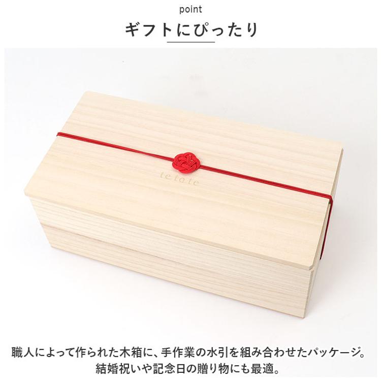 ・職人によって作られた木箱に、手作業の水引を組み合わせたパッケージ。結婚祝いや記念日の贈り物にも最適。