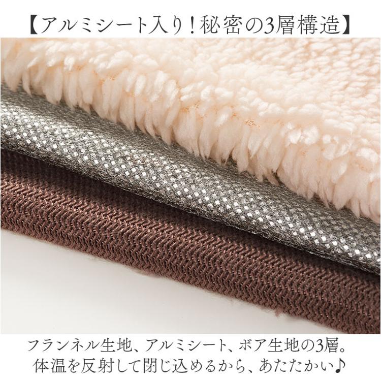 ・フランネル生地、アルミシート、ボア生地の3層。体温を反射して閉じ込めるから、あたたかい♪