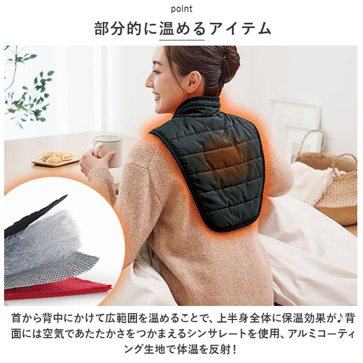 ・首から背中にかけて広範囲を温めることで、上半身全体に保温効果が♪背面には空気であたたかさをつかまえるシンサレートを使用、アルミコーティング生地で体温を反射!