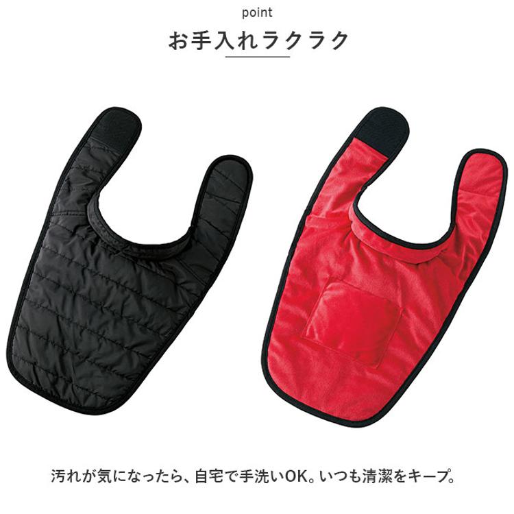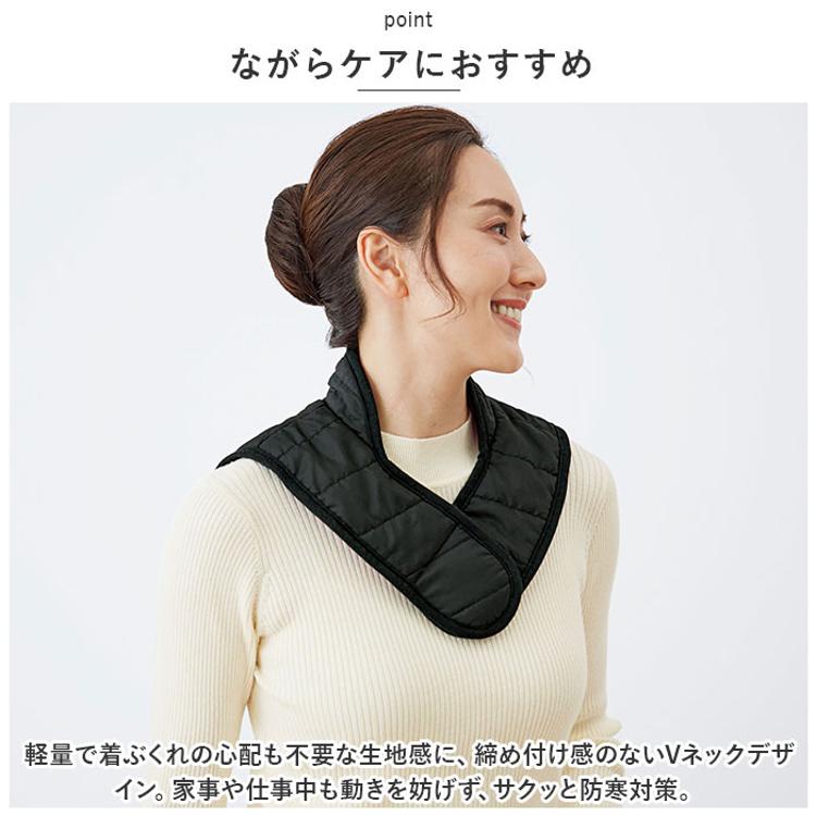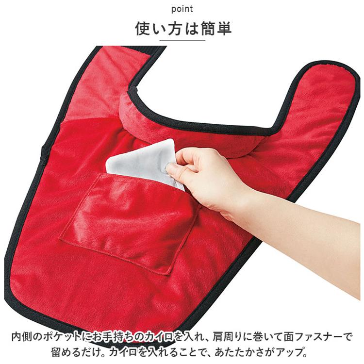 ・内側のポケットにお手持ちのカイロを入れ、肩周りに巻いて面ファスナーで留めるだけ。カイロを入れることで、あたたかさがアップ。