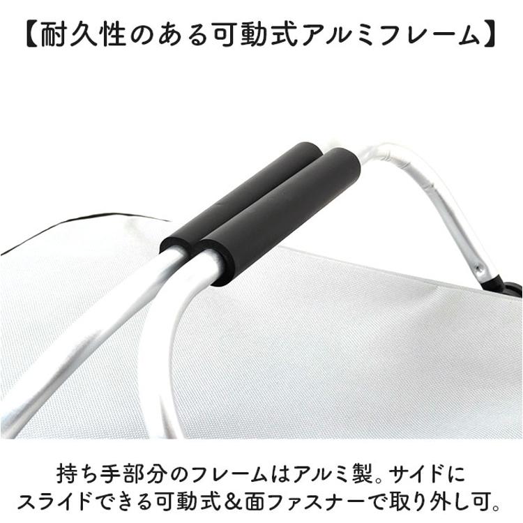 ・持ち手部分のフレームはアルミ製。サイドにスライドできる可動式&面ファスナーで取り外し可。