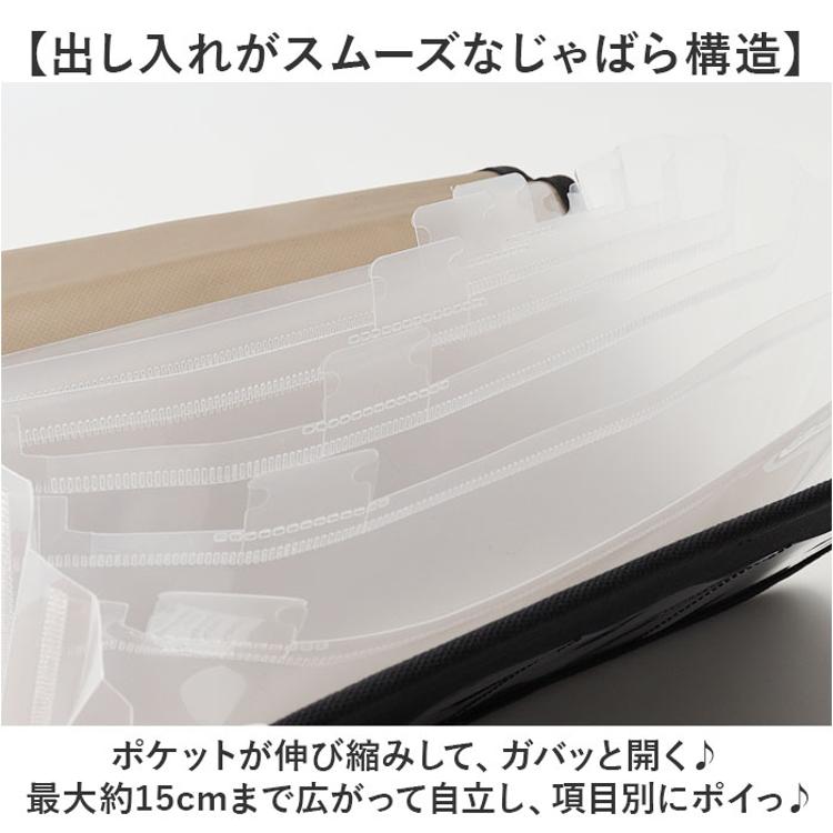 ・ポケットが伸び縮みして、ガバッと開く♪最大約15cmまで広がって自立し、項目別にポイっ♪