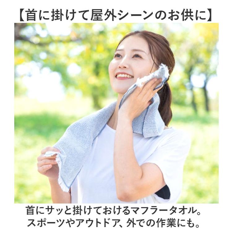 ・首にサッと掛けておけるマフラータオル。スポーツやアウトドア、外での作業にも。