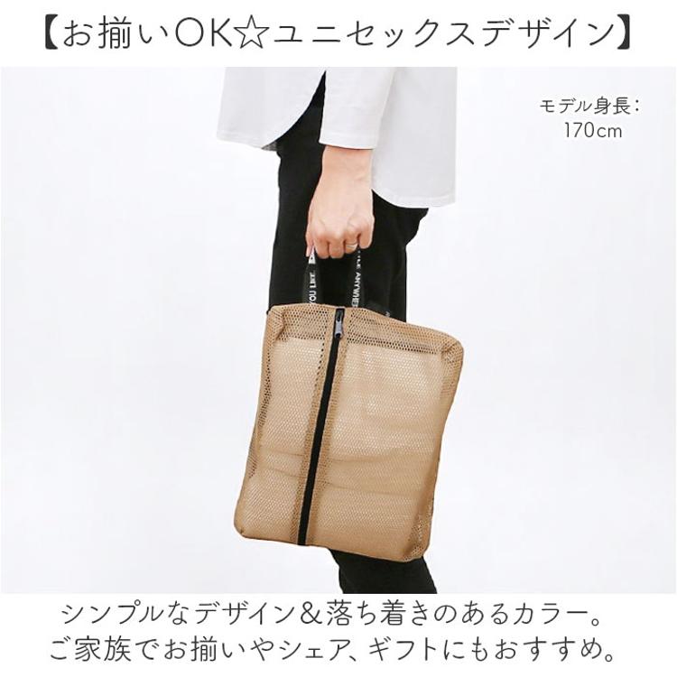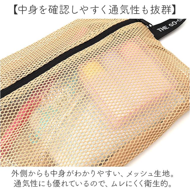 ・外側からも中身がわかりやすい、メッシュ生地。通気性にも優れているので、ムレにくく衛生的。