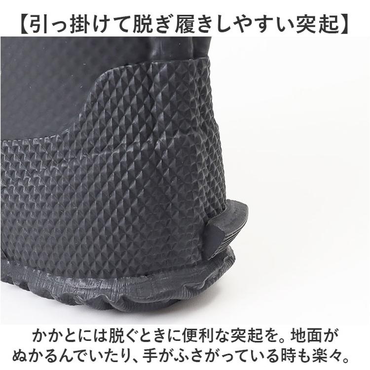 ・かかとには脱ぐときに便利な突起を。地面がぬかるんでいたり、手がふさがっている時も楽々。