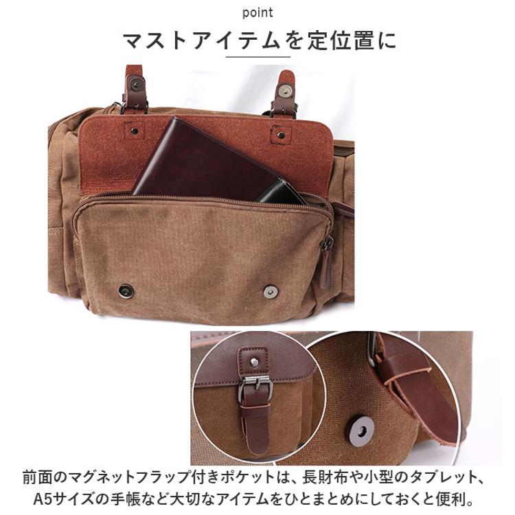 ・ユーズド感のある丈夫なキャンバス素材に、ブラウンのフェイクレザーを合わせたマニッシュなデザイン。男性はもちろん、女性でもメンズライクなコーデが叶う♪