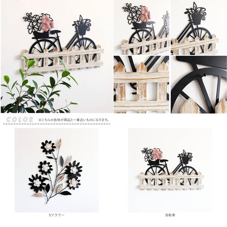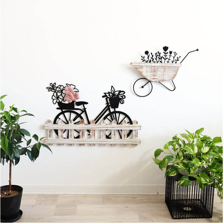 ・自転車シルエットのアイアン&シャビー仕上げのフェンス。ピンクのお花が可愛いワンポイント。