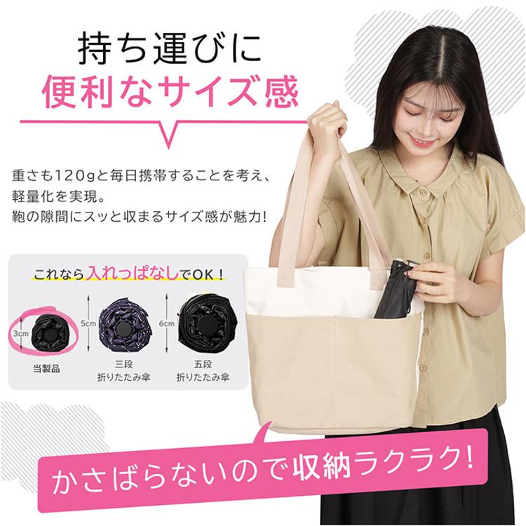 ・傘生地と同柄の収納袋付き。収納時はわずか約21.5cmとさらにコンパクトで、旅行のお供にも◎