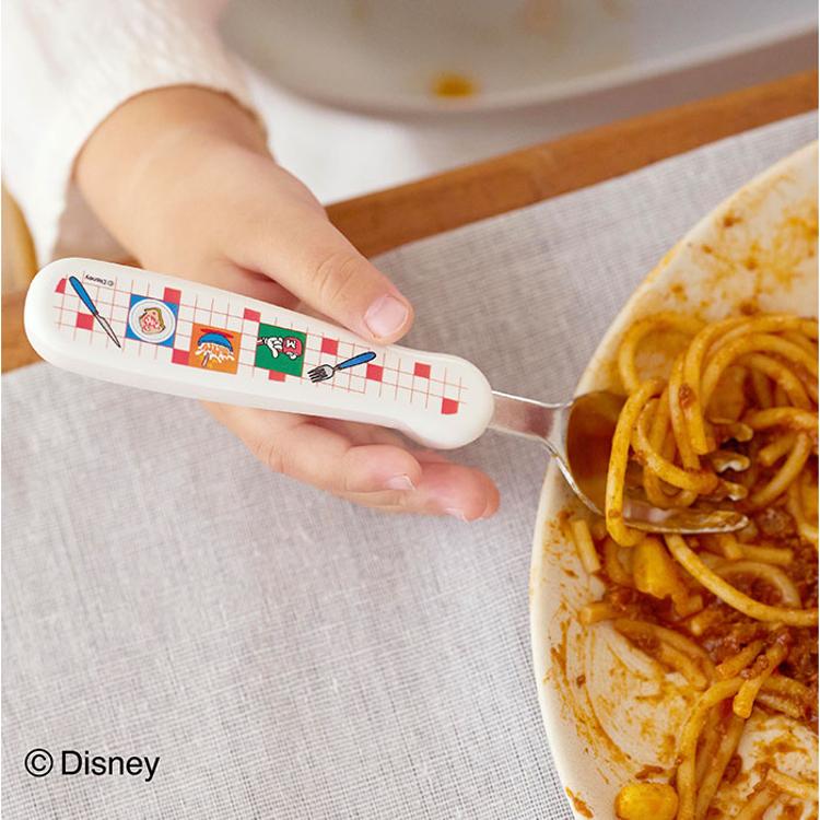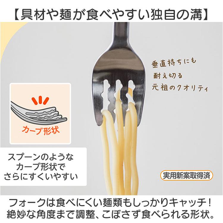 ・フォークは食べにくい麺類もしっかりキャッチ!絶妙な角度まで調整、こぼさず食べられる形状。