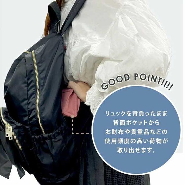 ・スマホや鍵がすぐ見つかる充実のポケット配置。背面にはファスナー付きポケットも。