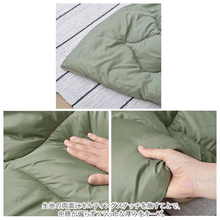 ・布団の中綿には、軽量でふかふかなポリエステル綿をたっぷりと充填。さらに、生地の両面にキルティングステッチを施すことで、中綿が偏らずフラットな厚みをキープ。