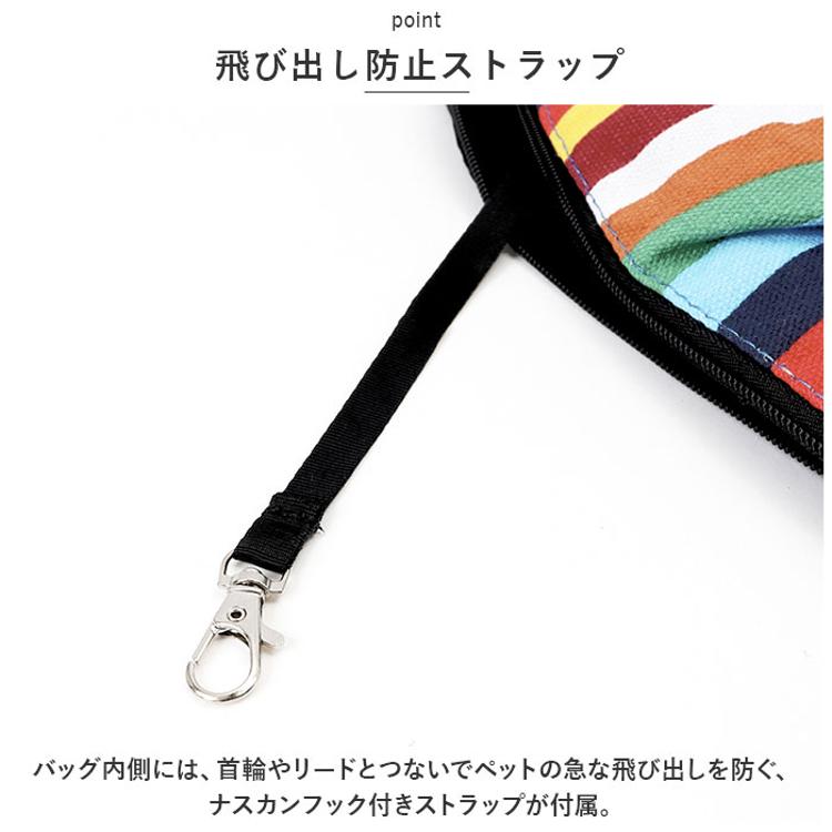 ・バッグ内側には、首輪やリードとつないでペットの急な飛び出しを防ぐ、ナスカンフック付きストラップが付属。