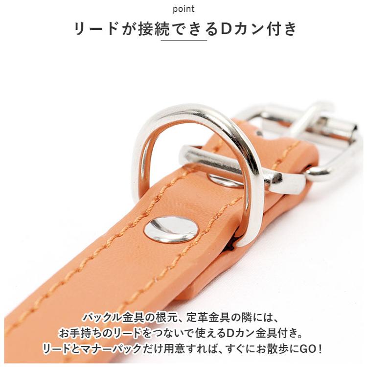 ・バックル金具の根元、定革金具の隣には、お手持ちのリードをつないで使えるDカン金具付き。リードとマナーパックだけ用意すれば、すぐにお散歩にGO!