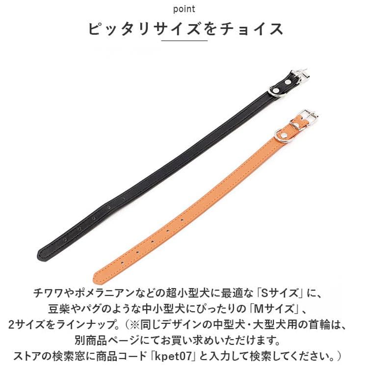 ・チワワやポメラニアンなどの超小型犬に最適な「Sサイズ」に、豆柴やパグのような中小型犬にぴったりの「Mサイズ」、2サイズをラインナップ。(※同じデザインの中型犬・大型犬用の首輪は、別商品ページにてお買い求めいただけます。ストアの検索窓に商品コード「kpet07」と入力して検索してください。)