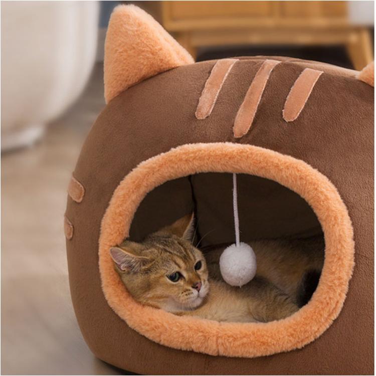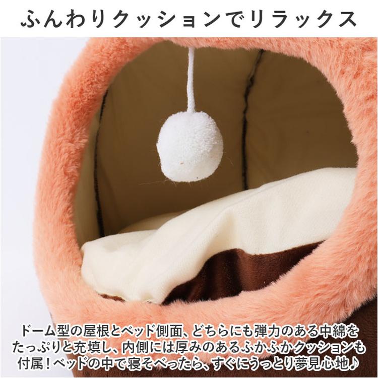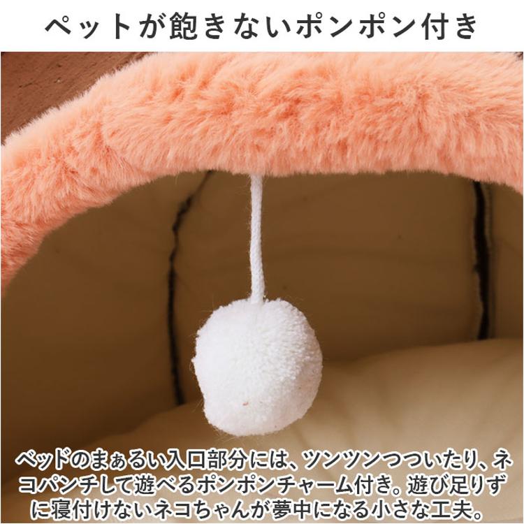 ・ベッドのまぁるい入口部分には、ツンツンつついたり、ネコパンチして遊べるポンポンチャーム付き。遊び足りずに寝付けないネコちゃんが夢中になる小さな工夫。