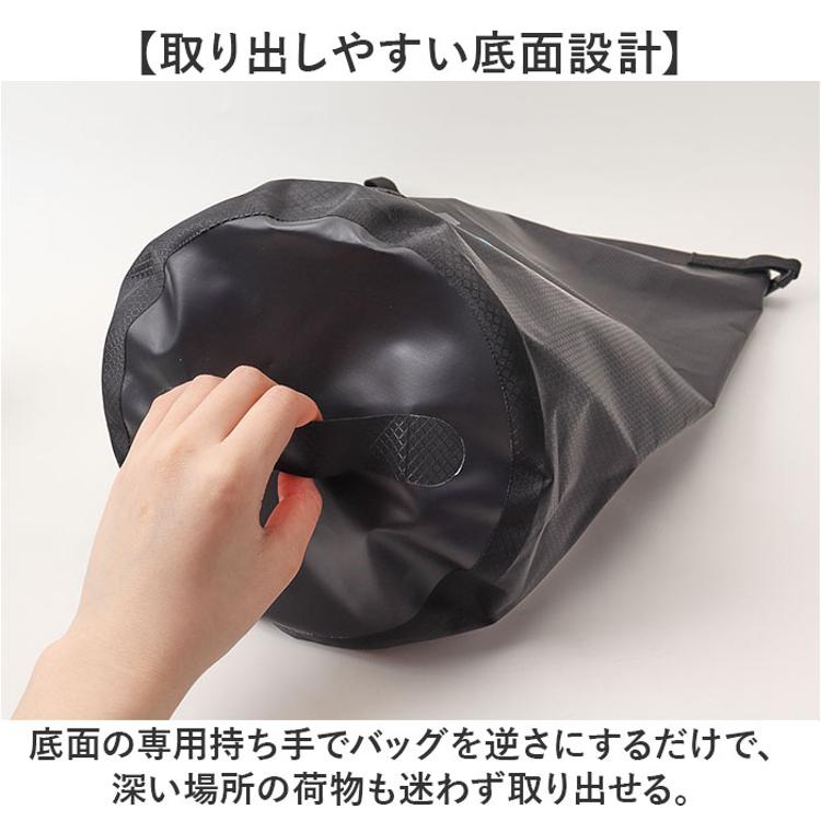 ・底面の専用持ち手でバッグを逆さにするだけで、深い場所の荷物も迷わず取り出せる。
