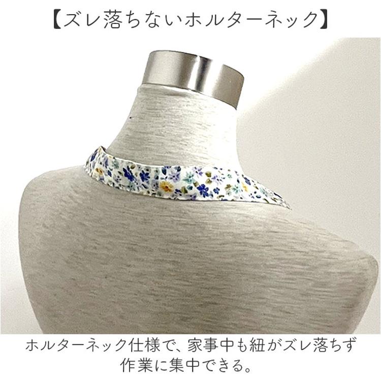・ホルターネック仕様で、家事中も紐がズレ落ちず作業に集中できる。