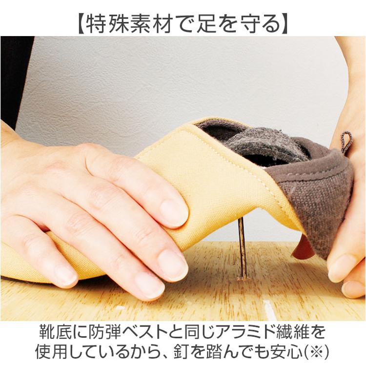 ・靴底に防弾ベストと同じアラミド繊維を使用しているから、釘を踏んでも安心※日本工業規格(JIS T 8107)による耐踏抜き性試験1100N(112.2kgf)をクリアしています。