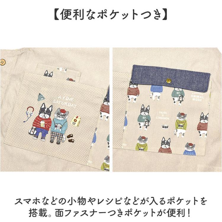 ・スマホなどの小物やレシピなどが入るポケットを搭載。面ファスナーつきポケットが便利!
