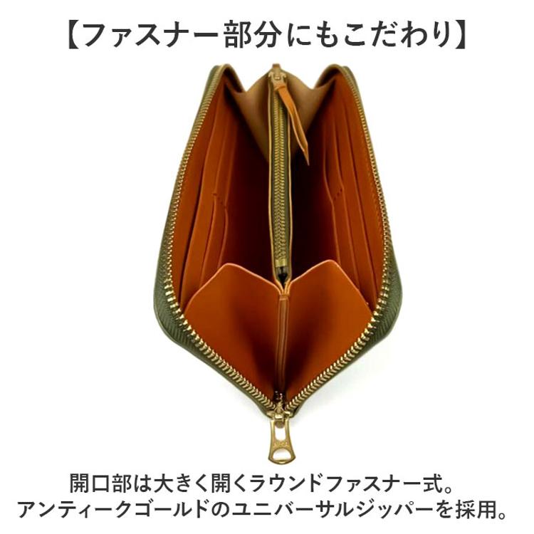 ・開口部は大きく開くラウンドファスナー式。アンティークゴールドのユニバーサルジッパーを採用。