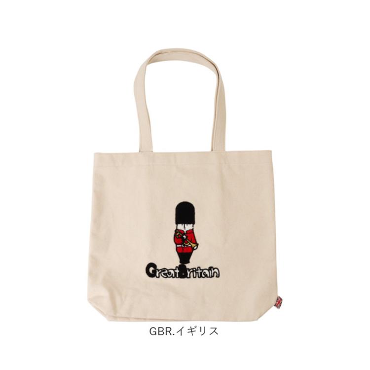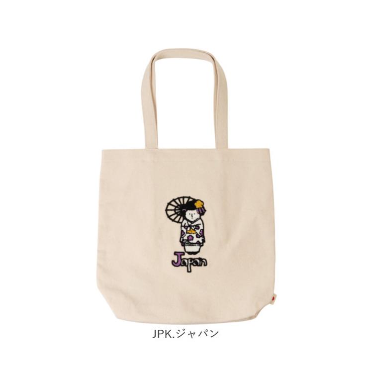 ・名物や風景をゆるっと描いたイラストと、カラフルなサガラ刺繍や国旗タグが愛らしいアクセント