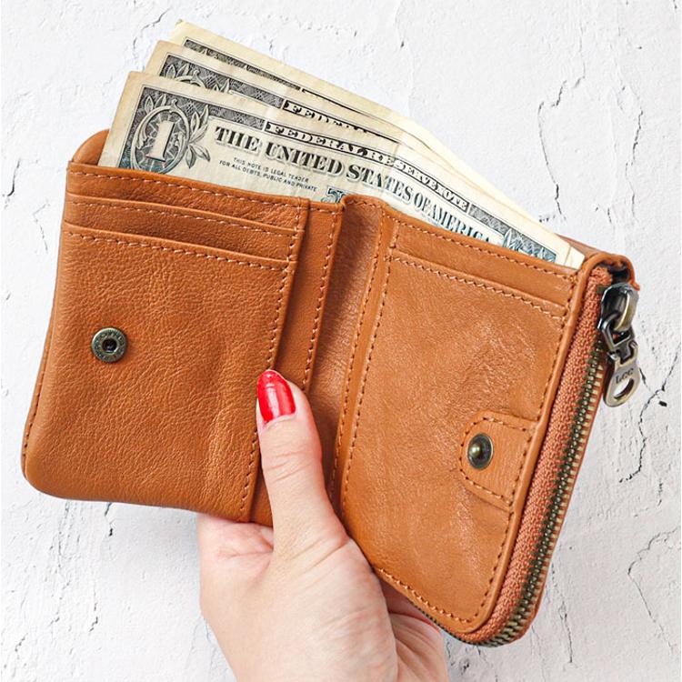 ・スナップボタン式の二つ折りタイプ。サッと開閉できて、お会計時も手間取らない!