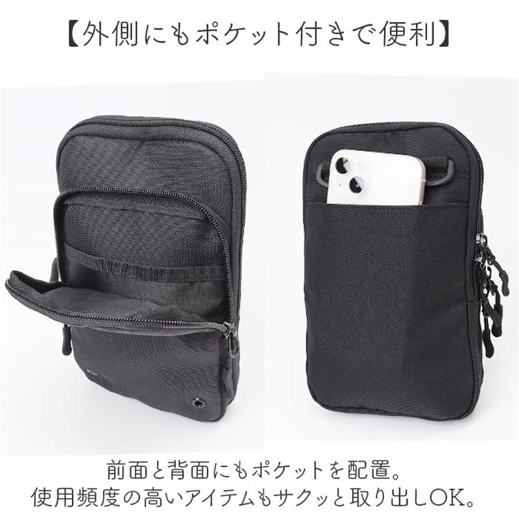 ・スマホなど必要最低限の物をIN。4つのポケットと3つのループ、Dカンを装備◎