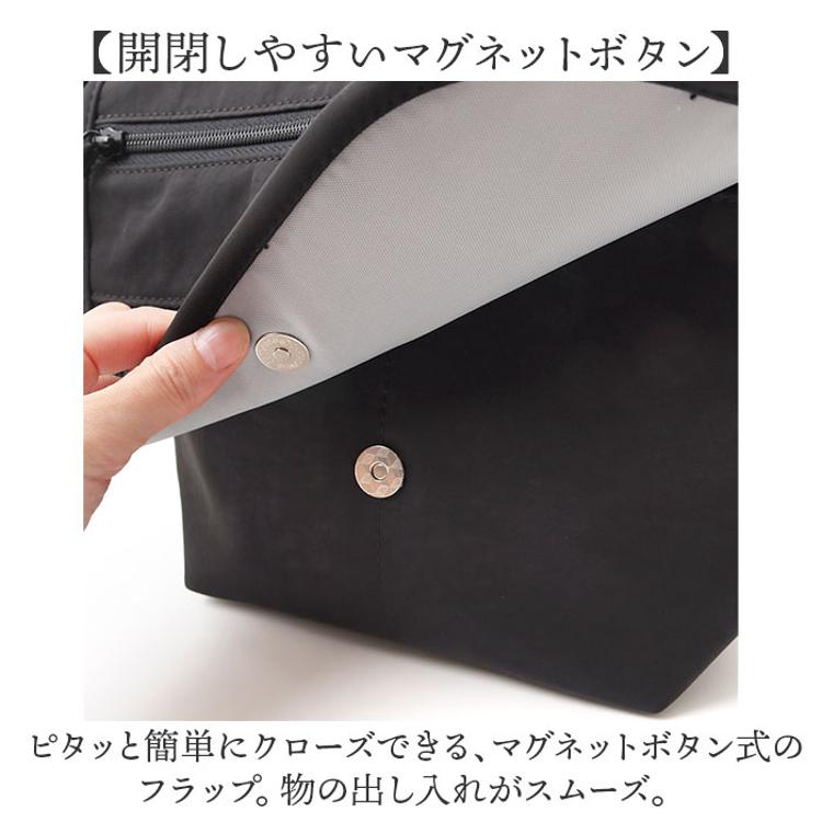 ・ピタッと簡単にクローズできる、マグネットボタン式のフラップ。物の出し入れがスムーズ。