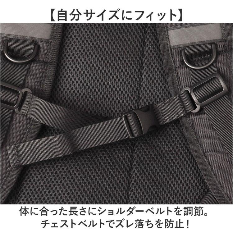 ・体に合った長さにショルダーベルトを調節。チェストベルトでズレ落ちを防止!