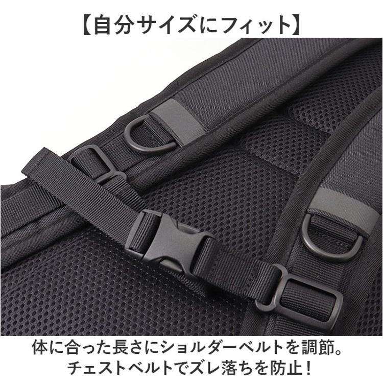 ・体に合った長さにショルダーベルトを調節。チェストベルトでズレ落ちを防止!