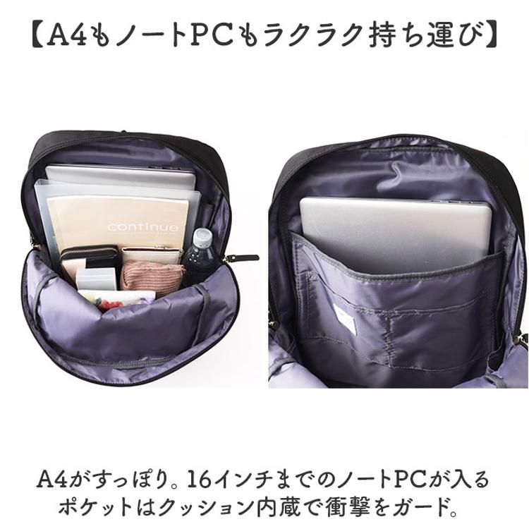 ・A4がすっぽり。16インチまでのノートPCが入るポケットはクッション内蔵で衝撃をガード。