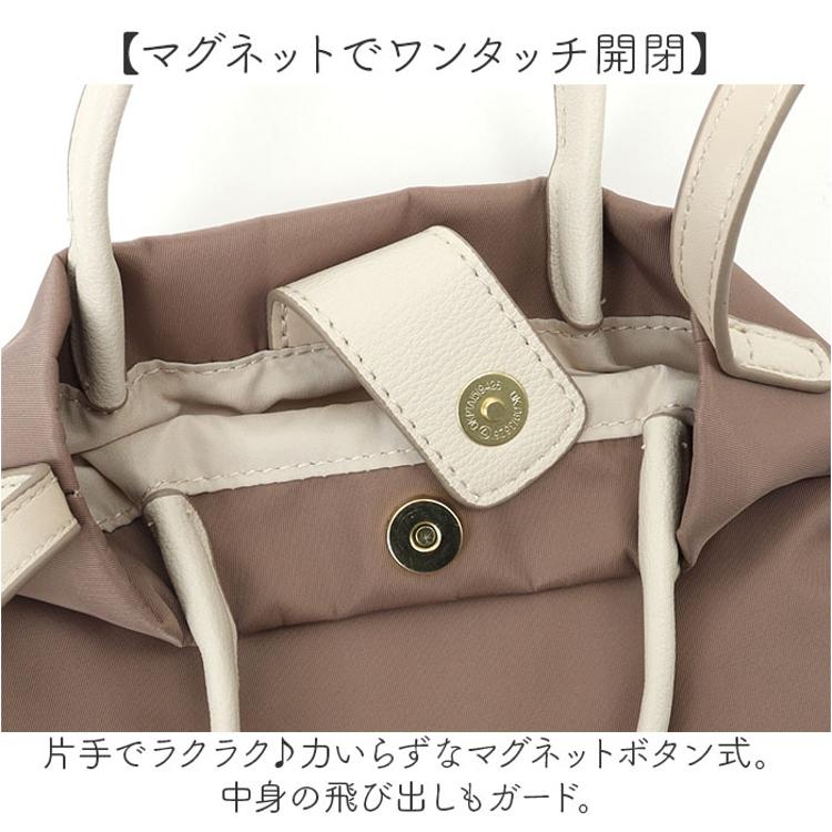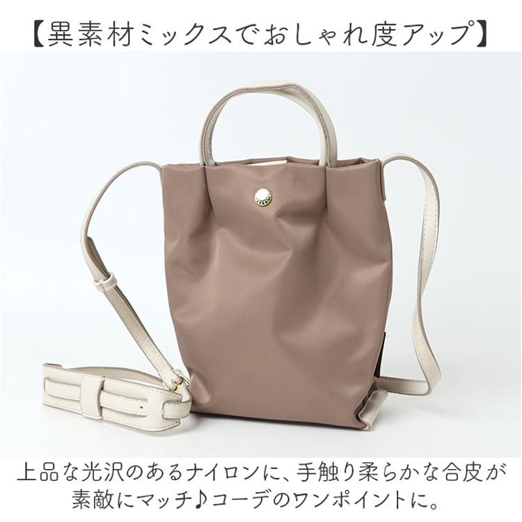 ・上品な光沢のあるナイロンに、手触り柔らかな合皮が素敵にマッチ♪コーデのワンポイントに。