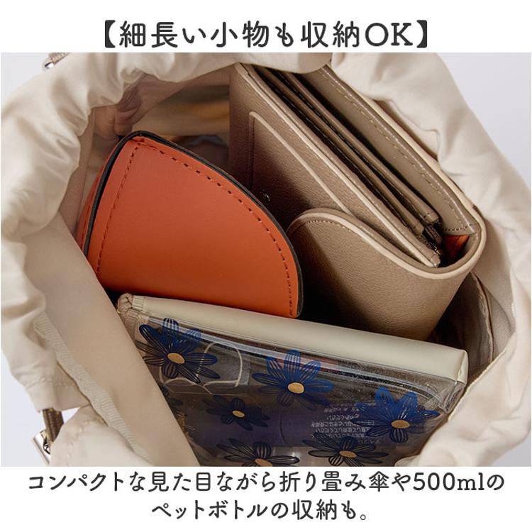 ・コンパクトな見た目ながら折り畳み傘や500mlのペットボトルの収納も。