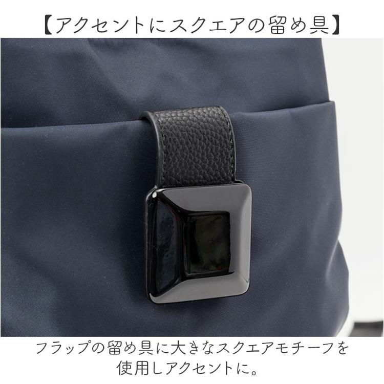 ・フラップの留め具に大きなスクエアモチーフを使用しアクセントに。