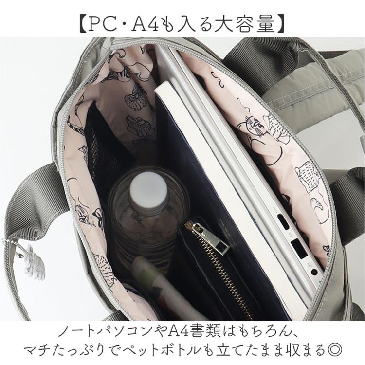 ・ノートパソコンやA4書類はもちろん、マチたっぷりでペットボトルも立てたまま収まる◎