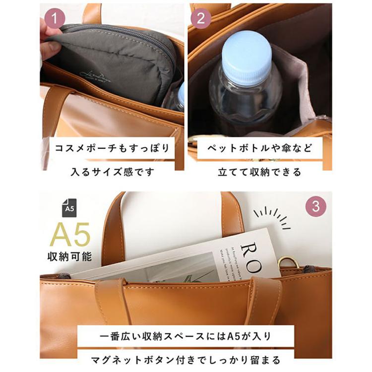 ・ポーチやボトルが入るオープン式の2ルーム&A5対応のマグネット式の1ルーム。収納上手に♪