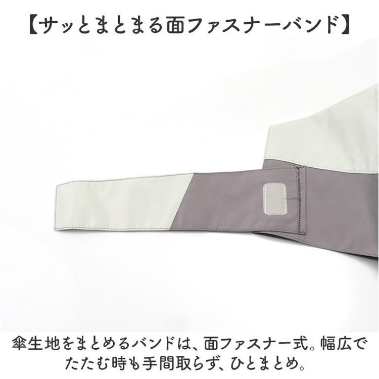 ・傘生地をまとめるバンドは、面ファスナー式。幅広でたたむ時も手間取らず、ひとまとめ。