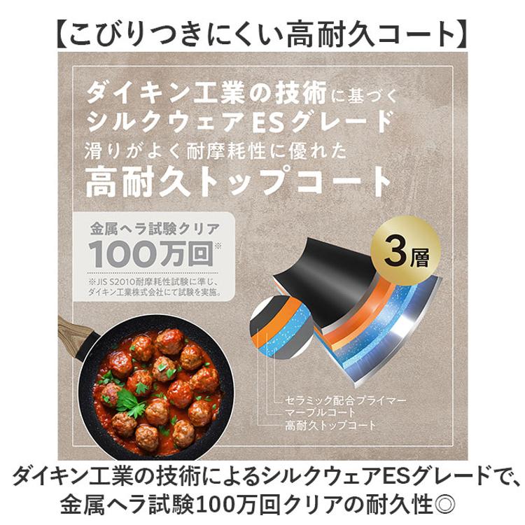 ・ダイキン工業の技術によるシルクウェアESグレードで、金属ヘラ試験100万回クリアの耐久性◎