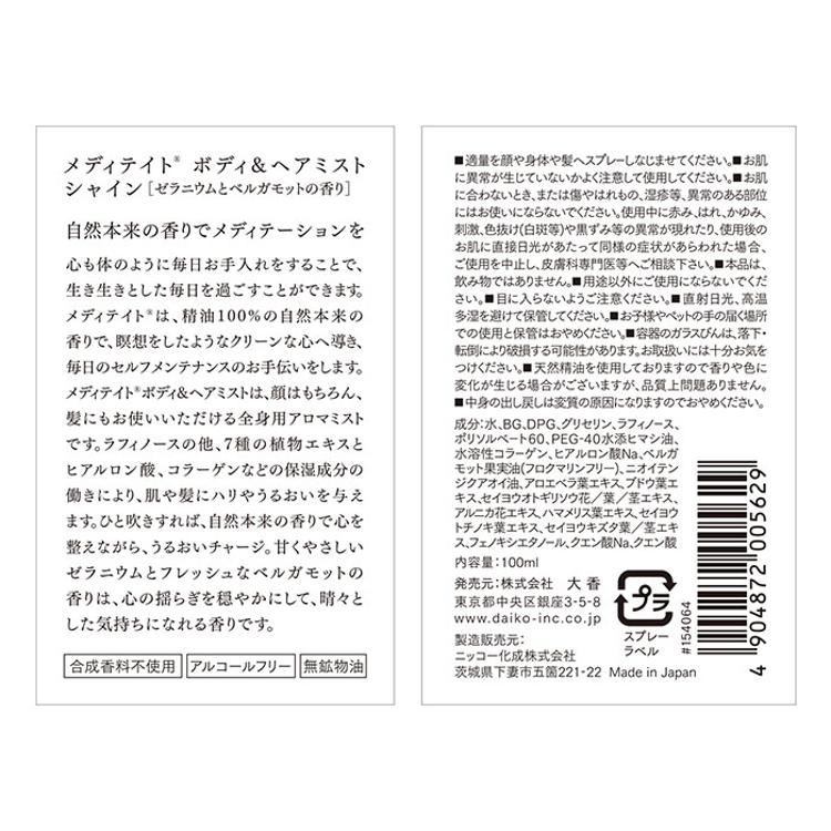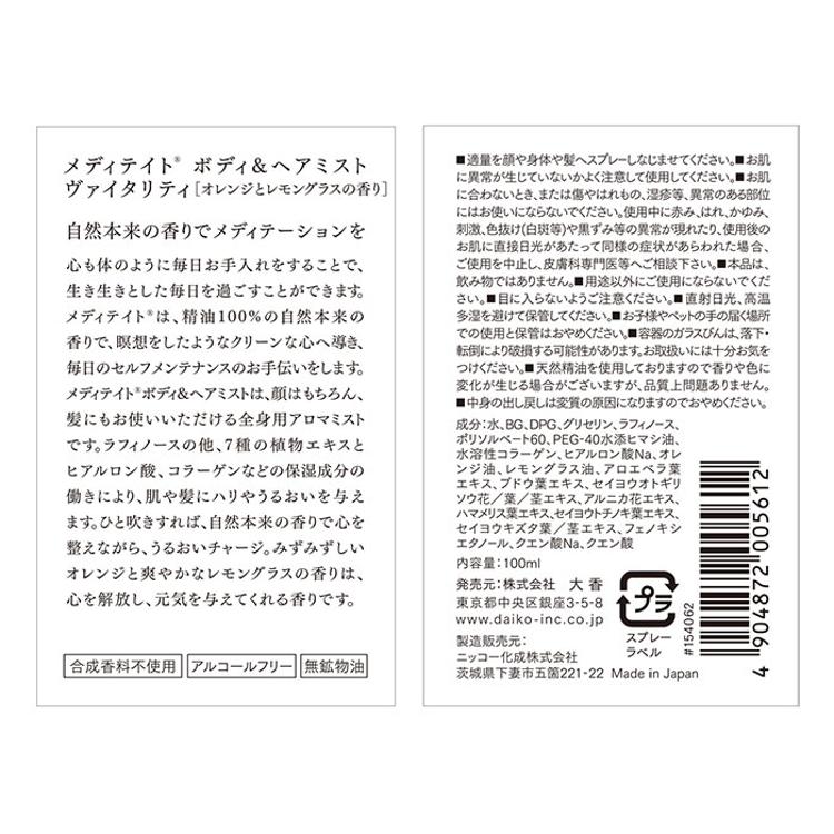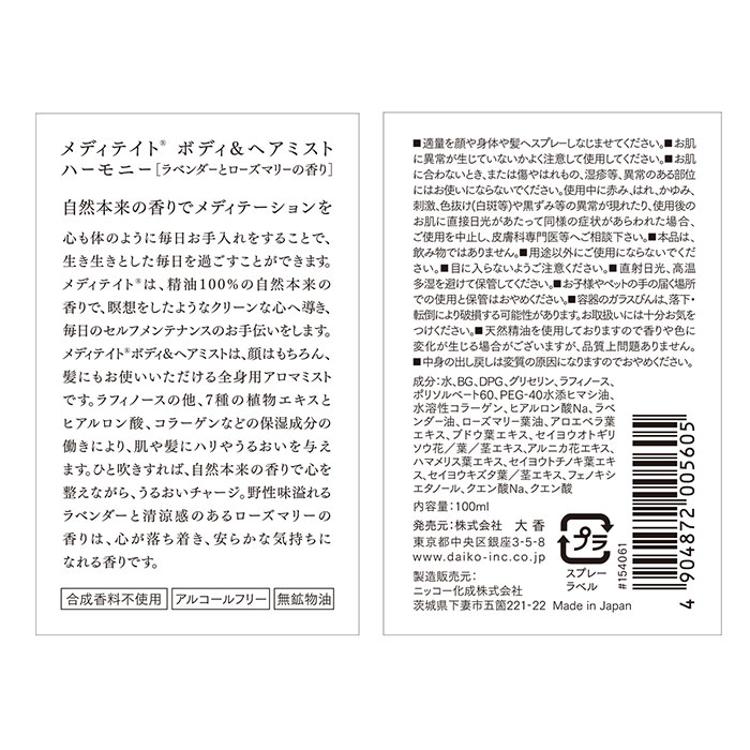 ボディミスト 通販 ヘアミスト いい香り ボディ&ヘアミスト 精油 良い香り メディテイト meditate ボディケア ヘアケア 香り 1540 大香 daiko 贈り物 ギフト プチギフト 肌 髪 おしゃれ